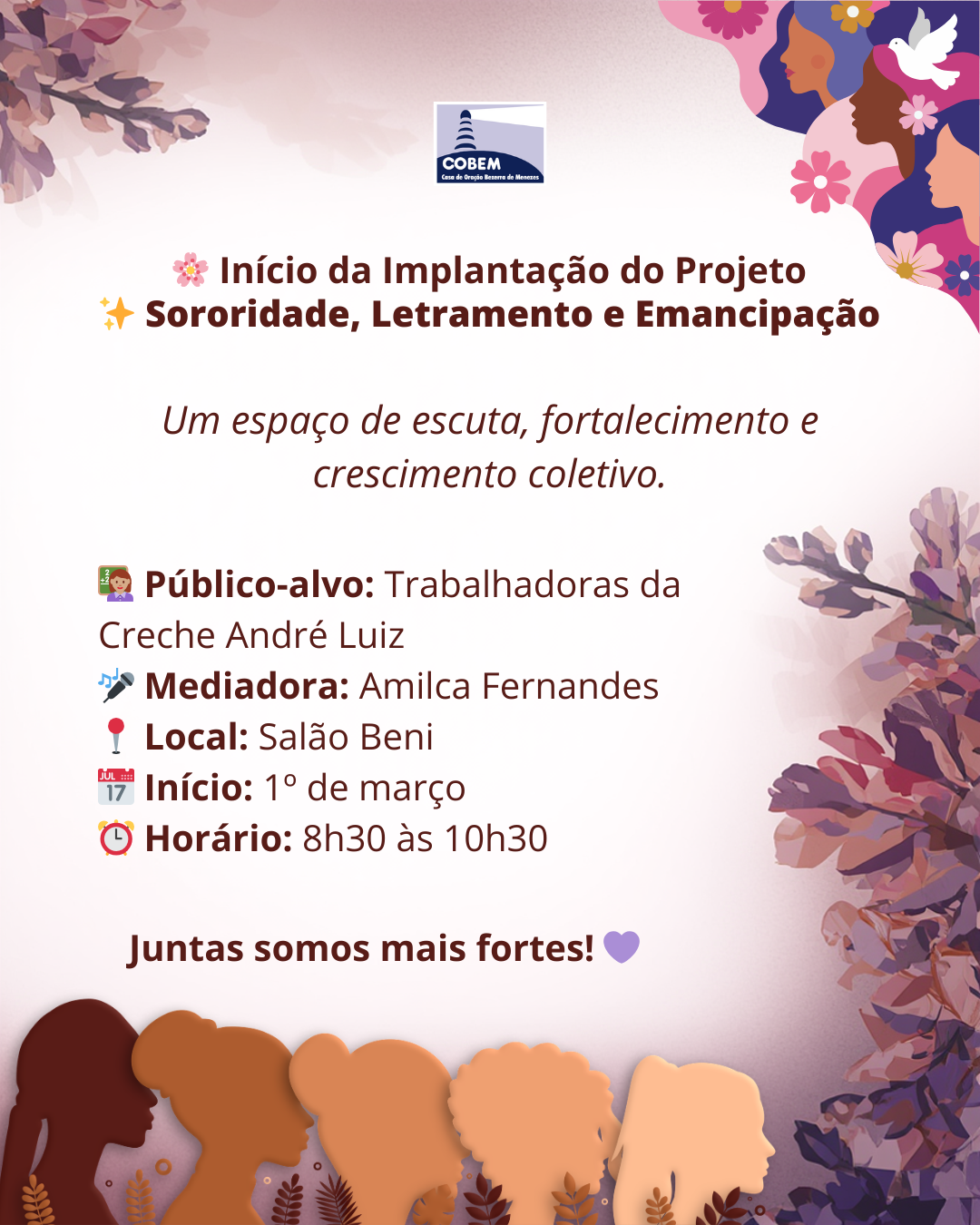 No dia 1º de março, terá início a implantação do Projeto Sororidade, Letramento e Emancipação, uma iniciativa voltada ao fortalecimento, à valorização e ao desenvolvimento das trabalhadoras da Creche André Luiz.