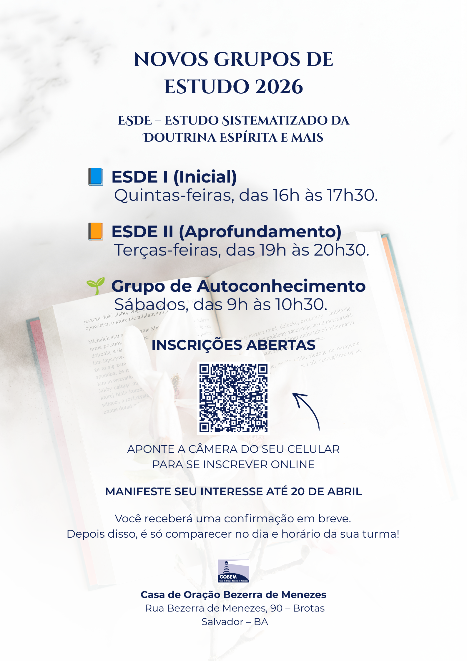 A Casa de Oração Bezerra de Menezes (COBEM) tem a alegria de anunciar a abertura das inscrições para as novas turmas de estudo do ano de 2026. Alinhada ao compromisso de promover o esclarecimento e o consolo através da Doutrina Espírita, a casa oferece este ano três frentes distintas de aprendizado e reforma íntima.